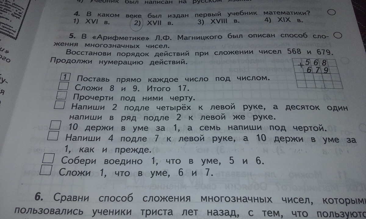 В Арефметике Л.Ф. Магнитского был описан способ сложения сногг значных чисел.Востанови порядок действий