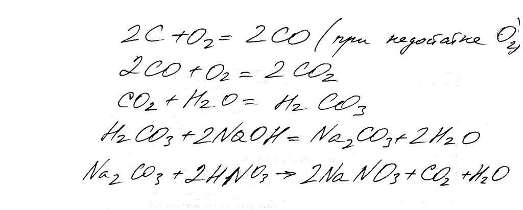 C ---> CO2 ---> H2CO3 ---> Na2CO3 ---> NaNO3