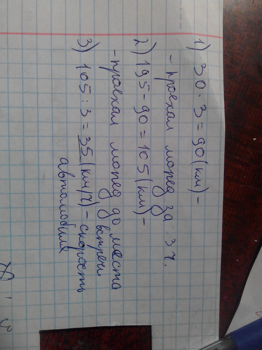 из двух городов, расстояние между которыми 195км, выехали навстречу друг другу мопед и легковой автомобиль. мопед ехал со скоростью 30 км/ч. с какой скоростью ехал автомобиль, если они встретились через 3 часа? (решение на фото)