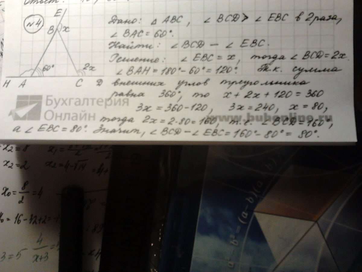 4. Один из внешних углов треугольника в два раза больше другого внешнего угла этого треугольника. Найдите разносе между этими внешними углами, если внутренний угол треугольника, не смежный с указанными внешними углами, равен 60*.