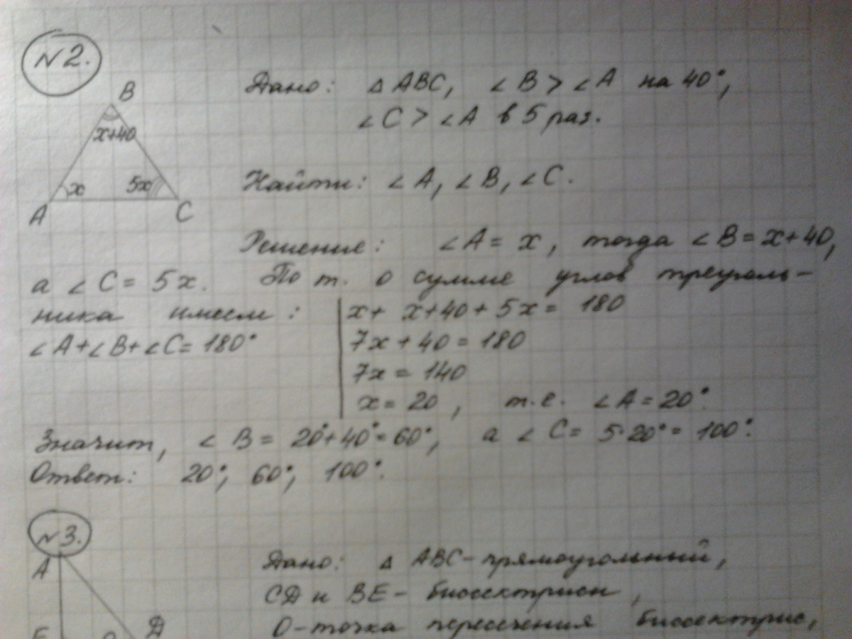 2. Найдите углы треугольника ABC, если угол B на 40*(*-градусов) больше угла A, а угол C в пять раз больше угла A.