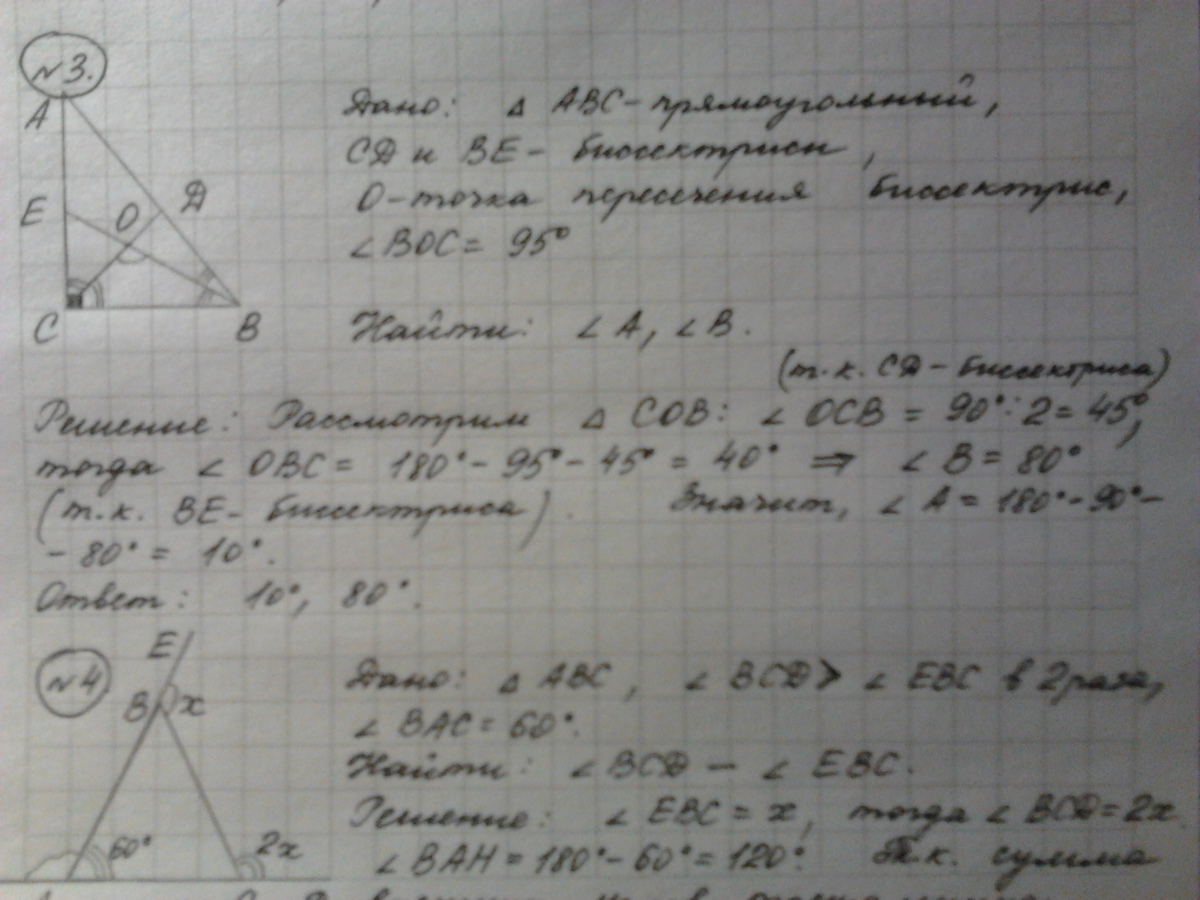 3. В прямоугольном треугольнике ABC(угол С=90*) биссектрисы CD и BE пересекаются в точке О. угол BOC=95*. Найдите острые углы треугольника ABC.
