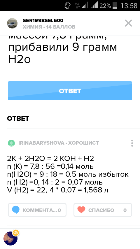 n (K) = 7,8 : 56 =0,14 моль