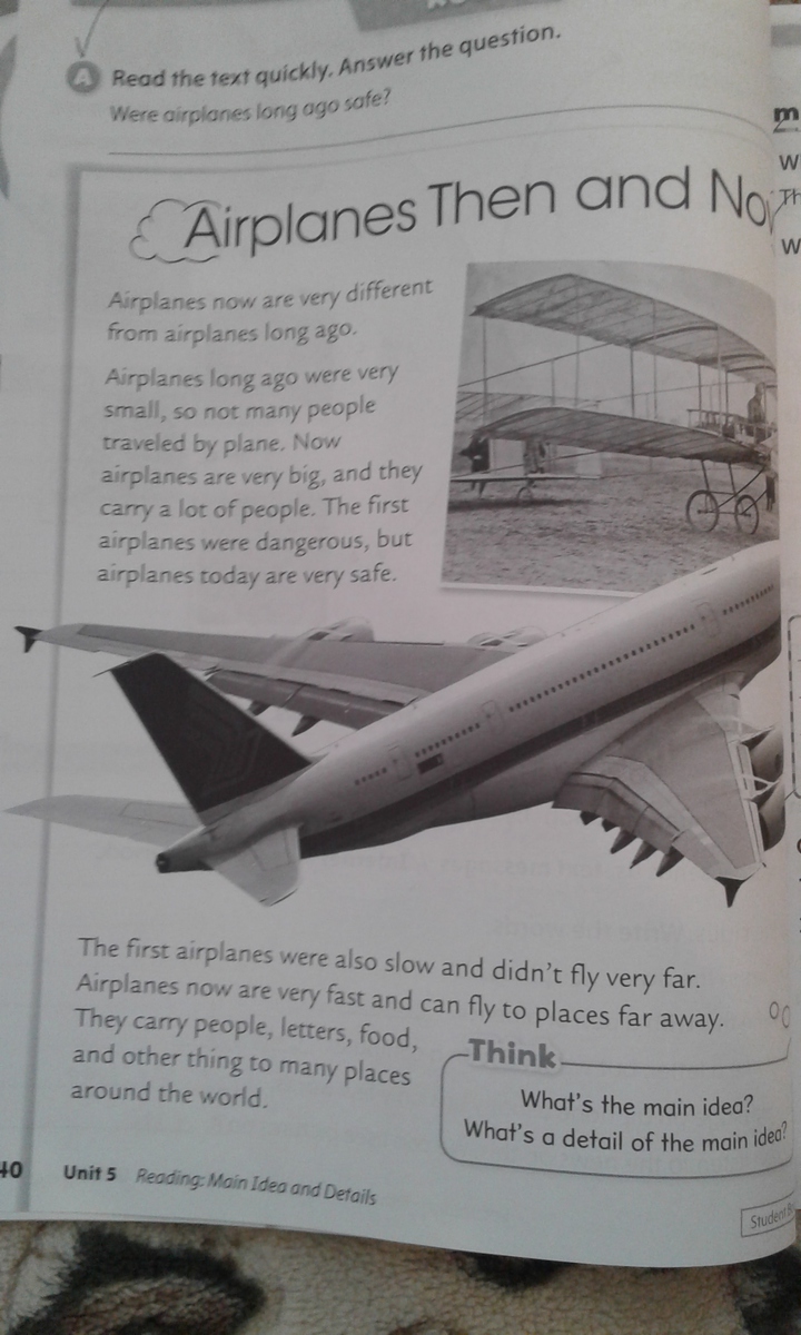 Самолёты в старине были очень маленькими, поэтому множество людей не путишествовали на самолётах. Сейчас самолёты очень большие и они несут много людей. Первые самолёты были опасными, но сегодняшние самолёты безопасные.