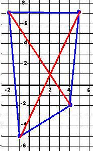 Постройте на координатной плоскости четырёхугольник ABCD с вершинами А(4,-2),В(-1,-5),С(-2,7),D(5,7) и проведите его диагонали.Какие координаты имеет точка пересечения диагоналей?