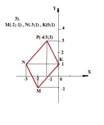 3) В параллелограмме MNKP диагонали делятся точкой пересечения пополам. Найдем координаты этой точки, то есть координаты середины отрезка NK: O((-3+0)/2;(1+1)/2) или О(-3/2;1).