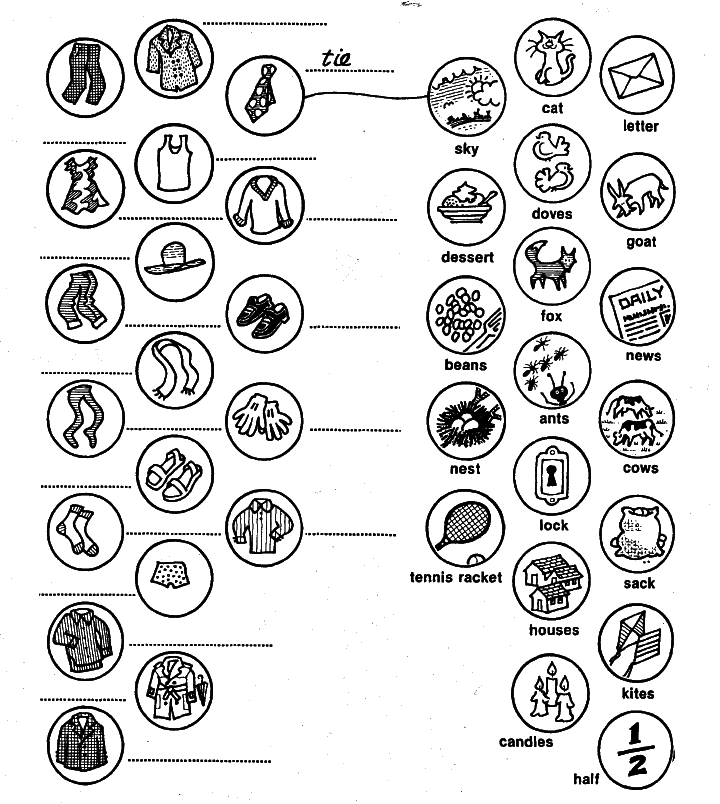 Посмотрите на вещи справа и находим одежду в рифму с каждым из слов.