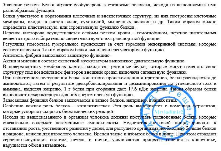 1. Белки являются одним из четырех основных органических веществ живой материи (белки, нуклеиновые кислоты, углеводы, жиры), но по своему значению и биологическим функциям они занимают в ней особое место. Около 30% всех белков человеческого тела находится в мышцах, около 20% — в костях и сухожилиях и около 10% — в коже. Но наиболее важными белками всех организмов являются ферменты, которые, хотя и присутствуют в теле и в каждой клетке тела в малом количестве, тем не менее, управляют рядом существенно важных для жизни химических реакций. Все процессы, происходящие в организме — переваривание пищи, окислительные реакции, активность желез внутренней секреции, мышечная деятельность и работа мозга, — регулируются ферментами. Разнообразие ферментов в теле организмов огромно. Даже в маленькой бактерии их насчитываются многие сотни.