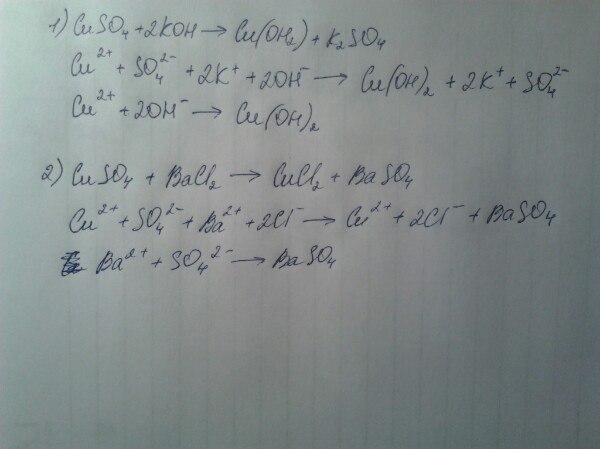 пожалуйста ! помогите составить полное и краткое ионное уравнения 1)CuSO4+2KOH=Cu(Oh)2+K2SO4 2)CuSO4+BaCl2=CuCl2+BaSO4