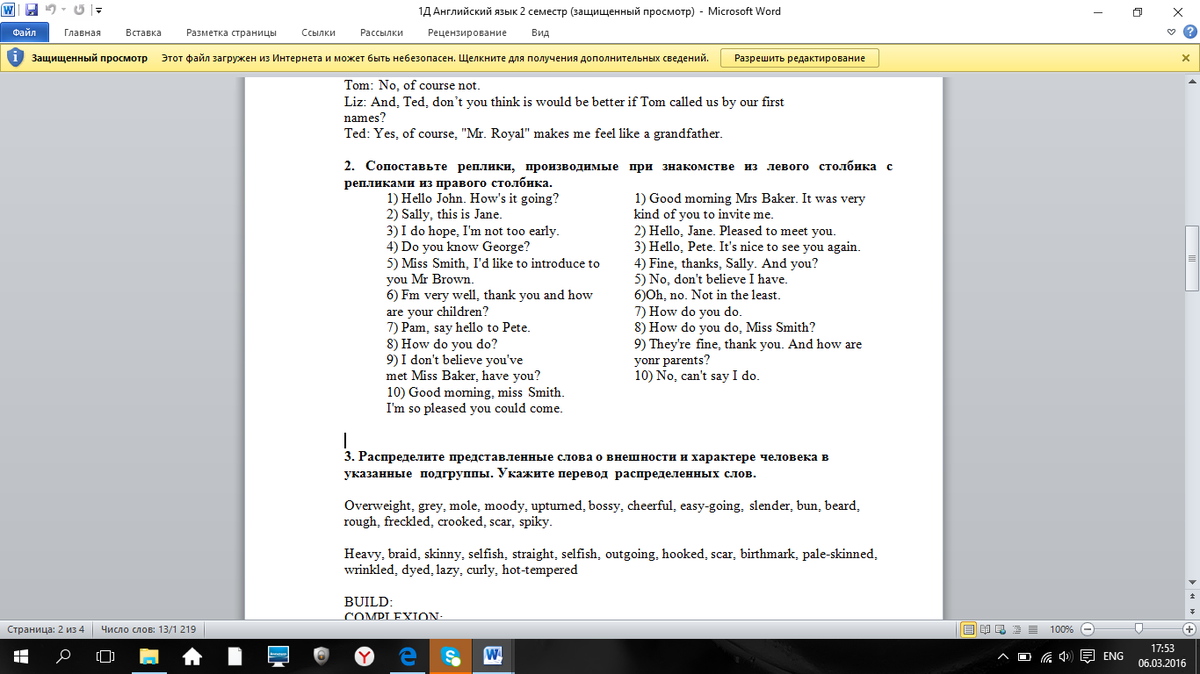 2. Сопоставьте реплики, производимые при знакомстве из левого столбика с репликами из правого столбика.