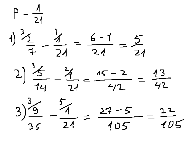 1) 2/7-1/21=6/21-1/21=5/21; 2)5/14-1/21=15/42-2/42=13/42; 3)9/35-1/21=27/105-5/105=22/105.