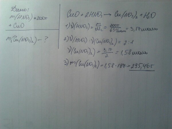 Вычислите массу соли, образующейся при взаимодействии 200 г азотной кислоты с достаточным количеством оксида меди(||)