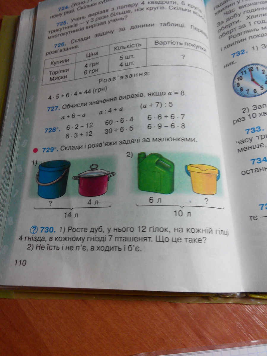 внизу написано число литров 14 и 10 в первом ведре неизвесно литров а в кастрюле 4 литра значит надо зделать так 14-4=10 значит десять литров в другом тоже самое 10-6=4 литров