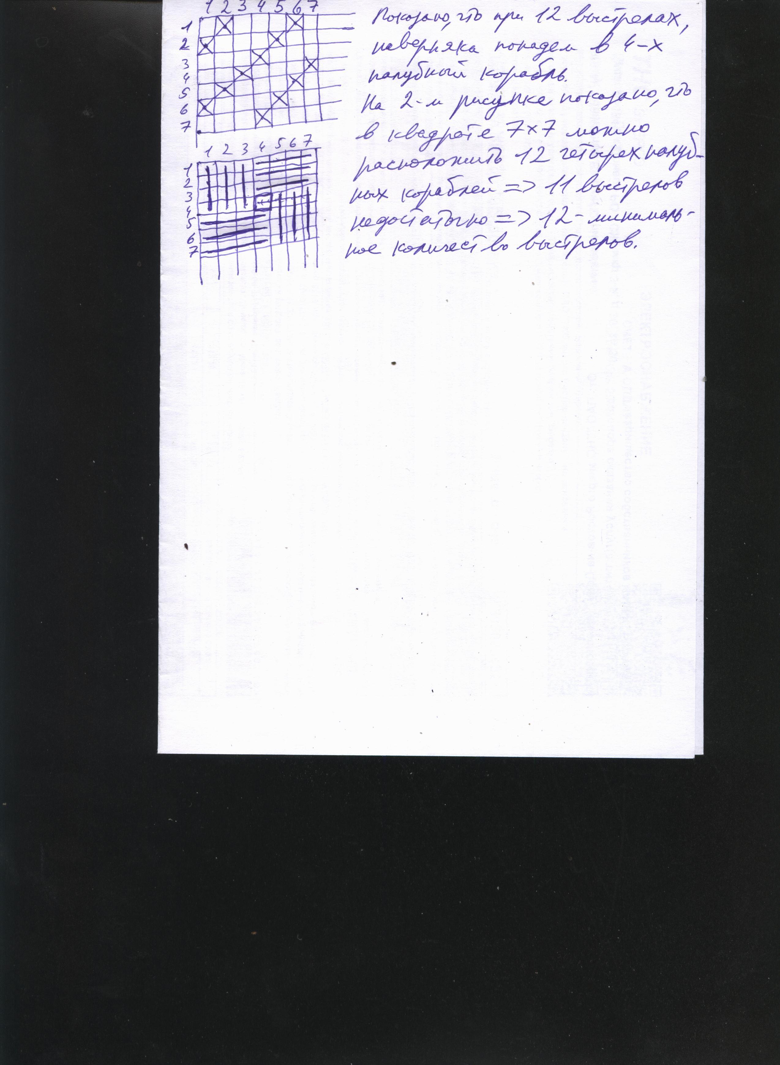 игра морской бой в квадрате 7на7 клеток. КАКОЕ НАИМЕНЬШЕЕ ЧИСЛО ВЫСТРЕЛОВ НУЖНО СДЕЛАТЬ,ЧТОБЫ ПОПАСТЬ В КОРАБЛЬ ПРОТИВНИКА ,СОСТОЯЩИЙ ИЗ 4 КЛЕТОК,РАСПОЛОЖЕННЫХ ПОДРЯД ПО ГОРИЗОНТАЛИ ИЛИ ВЕРТИКАЛИ