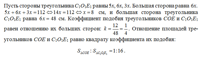 Треугольник C1O1E1 и COE подобны. Периметр треугольника C1O1E1 равен 112 см. Его стороны пропорциональны числам 5,6,3. Большая сторона треугольника COE равна 12 см. Вычислите отношение площадей треугольников COE и C1O1E1.