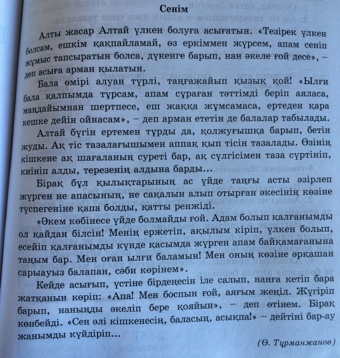 4)Ылғи бала қалпымда тұрсам, апам сұраған тәттімді беріп аяласа, маңдайымнан шертпесе, еш жаққа жұмсамаса, ертеден қара кешке дейін ойнасам.