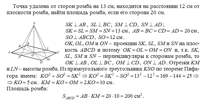 1)точка удалена от сторон ромба на 13 см,находится на расстоянии 12 см от плоскости,найти площадь если сторона 20 см