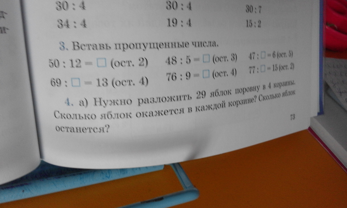 Ответ:В каждой корзине будет 7 яблок, а останется 1 яблоко.