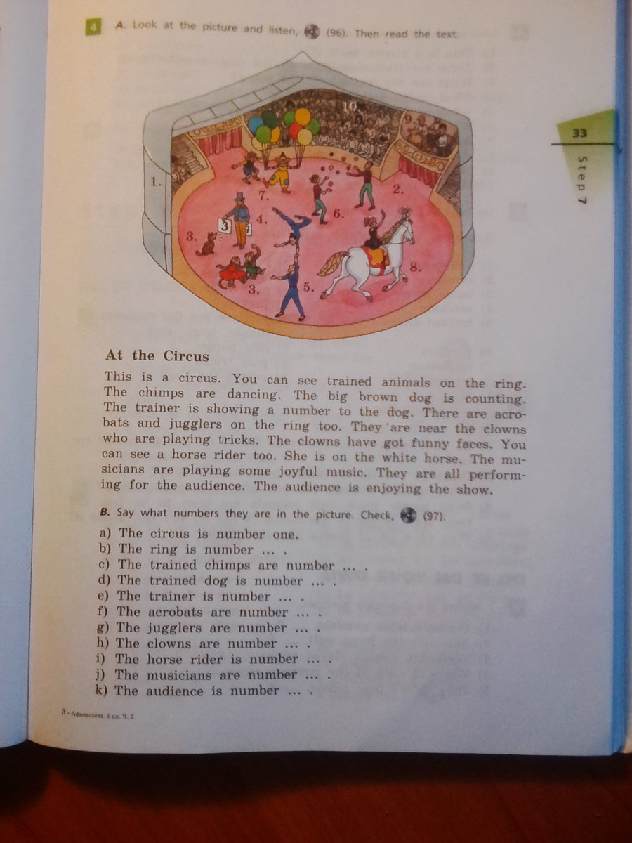 В цирке Это цирк. Вы можете увидеть дрессированных животных на кольце. Шимпанзе танцы. Большая коричневая собака рассчитывает тренер показывает ряд к собаке. Есть ACRO летучие мыши и жонглеры на ринг. Они рядом с клоунами, которые играют трюки. Клоуны получили рожи. Вы можете увидеть всадника тоже. Она находится на белом коне. В sicians мю играют некоторую радостную музыку. Все они выполняют ING для аудитории. Зрители наслаждаются шоу.