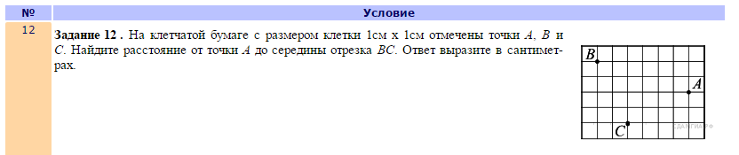 Срочно На клетчатой бумаге с размером клетки 1см x 1см отмечены точки А, В и С. Найдите расстояние от точки А до середины отрезка ВС. Ответ выразите в сантиметрах.