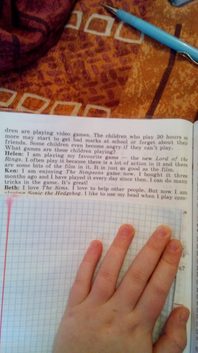 Хеллен: Я играю в мою любимую игру - новый "Властелин колец". Я часто в неё играю потому, что в там много действий и есть некоторые части фильма. Она так же хороша, как и фильм.