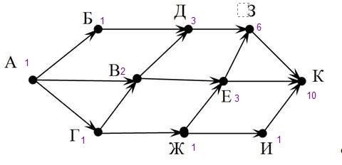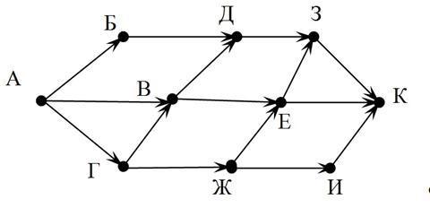 На рисунке изображена схема дорог, связывающих города А, Б, В, Г, Д, Е, Ж, З, И, К. По каждой дороге можно двигаться только в одном направлении, указанном стрелкой.