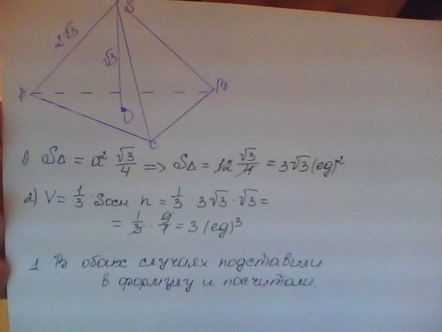 В правильной треугольной пирамиде ее боковое ребро равно 2 корня из 3, а высота корень из 3. Найти объем пирамиды.)