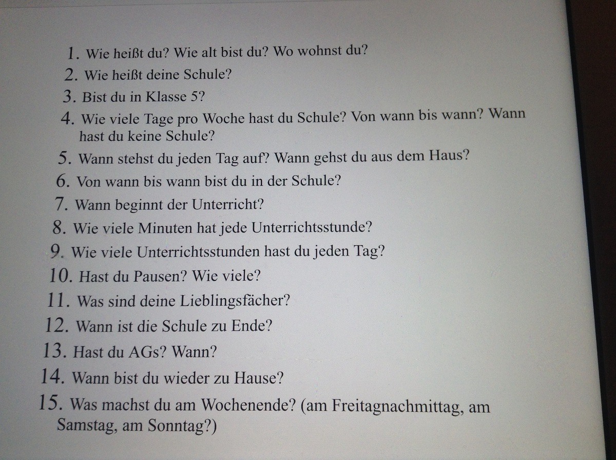 Ich heiße Helga. Ich bin yehn Jahre alt. Ich wohne in Irkutsk. Meine Schule heißt Irkutskaya. Ich bin in Klasse 5. Ich habe Schule 6 Tage pro Woche. Ich stehe um 7 Uhr jeden Tag auf. Ich gehe um 8 Uhr aus dem Haus. Ich bin von 9 bis 12 Uhr in der Schule. Der Unterricht beginnt um 9 Uhr. Jede Unterrichtsstunde hat 45 Minuten. Ich habe 4 Unterrichtsstunden jeden Tag. Ich habe 3 Pausen. Meine Lieblingsfächer sind Russisch, Deutsch, Mathematik. Um 12 Uhr ist die Schule zu Ende. Ich habe AGs nicht. Um 13 Uhr bin ich wieder zu Hause. Am Wochenende male ich.