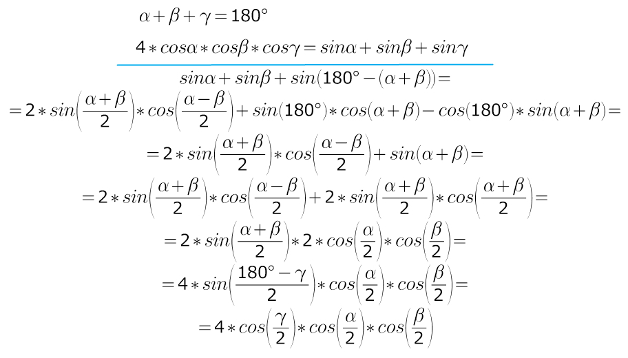 Докажите, что если альфа,бета,гамма - углы треугольника, то выполняется равенство:4*cos(альфа/2)*cos(бета/2)*cos(гамма/2)=sin(альфа)+sin(бета)+sin(гамма)