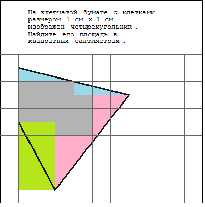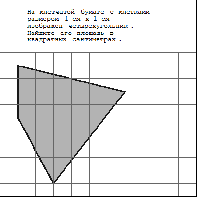 На клеточной бумаге с клетками размером 1 см х 1 см изображен четырехугольник. Найдите его площадь в квадратных сантиметрах.