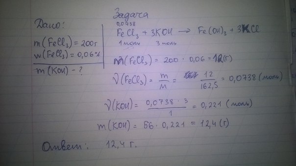 Вычислительной массу осадка, полученного в результате взаимодействия 200 г раствора хлорида железа (3) с массовой долей 6% с раствором гидроксида калия. Какая масса гидроксида калия была затрачено на эту реакцию.