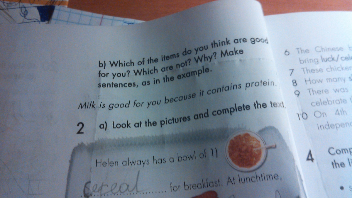 Oil,butter,eggs,fish,latuce,rice,bread,pasta,potatoes,spring onions,orange juice - по образцу с молоком сделайте точно также, но со словами:fat,protein,vitamins,carbohydrates. вот на русском образец: олея вредна потому что в ней жиры. как-то так а дальше сами но на английском. заранее спс