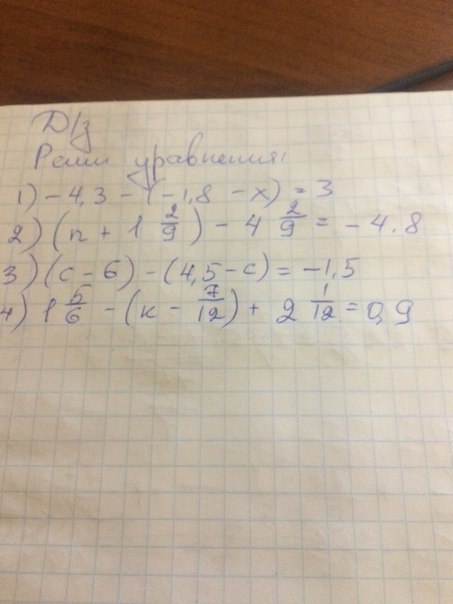 Решите плиз уравнения: 1. -4,3-(-1,8-x)=3 2. (n+1 2/9)-4 2/9=-4.8 3. (с-6)-(4.5-с=1.5