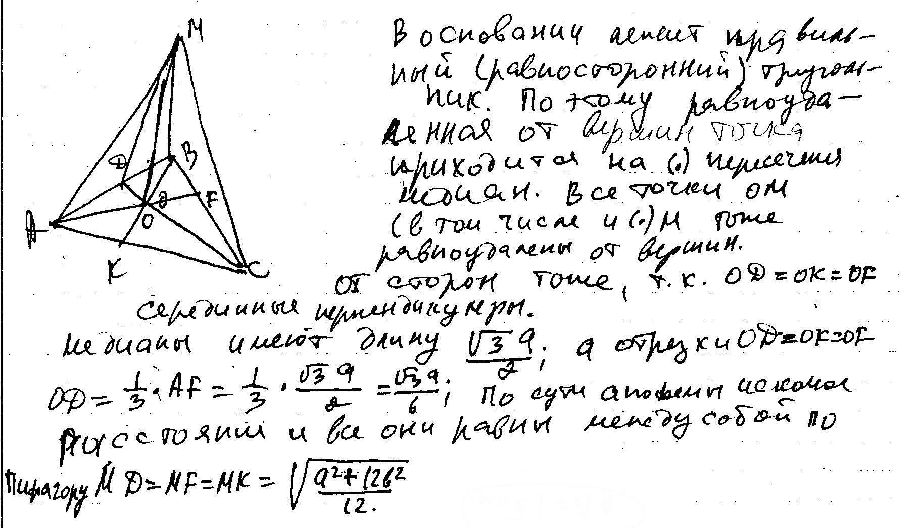 Точка М равноудалена от всех вершин правильного треугольника со стороной a и удалена от плоскости треугольника на расстояние b. Найдите расстояние от точки М до сторон треугольника.