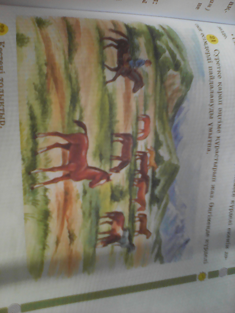 Бір күні Амангелді ата жылқыларды бағып жүрген.Осы жерде көп жылқылар болған еді.Жылқыладрың түстері әр түрлі болды.Біреіунің түсі көк ала,екіншісінің қоңыр ақ,үшіншісінің қызғылт сары,төртіншісінің сары ала.Олардың арасында қара жылқы болды.Сол қара жылқыда Амангелді ата отырған.