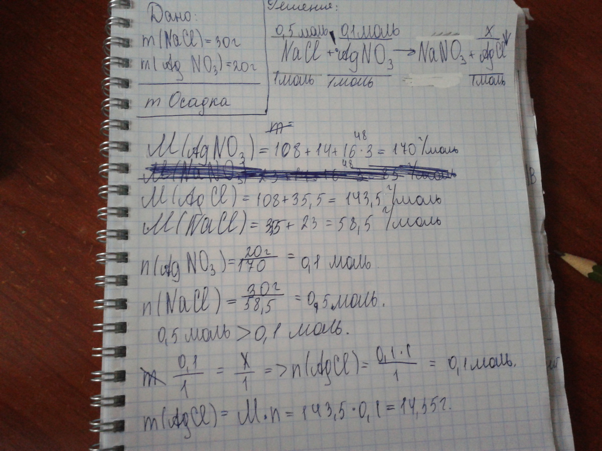При смешивании 30 г поваренной соли с 20г нитрата серебра получили осадок. Рассчитайте массу осадка
