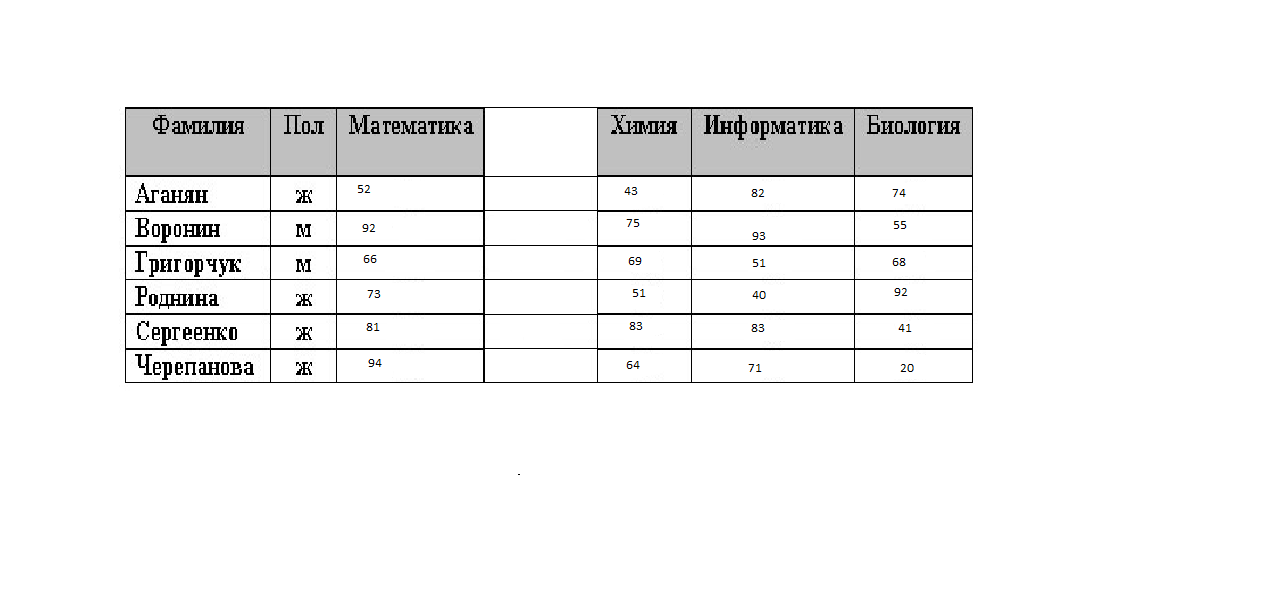 ниже в табличной форме представлен фрагмент базы данных о результатах тестирования учащихся (используется 100 бальная шкала)