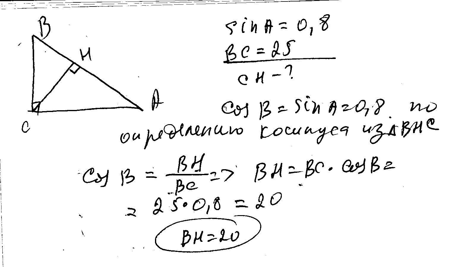 В треугольнике АВС угол С равен 90градусов , СН высота ,ВС =25 sinA =0,8 Найдите ВН