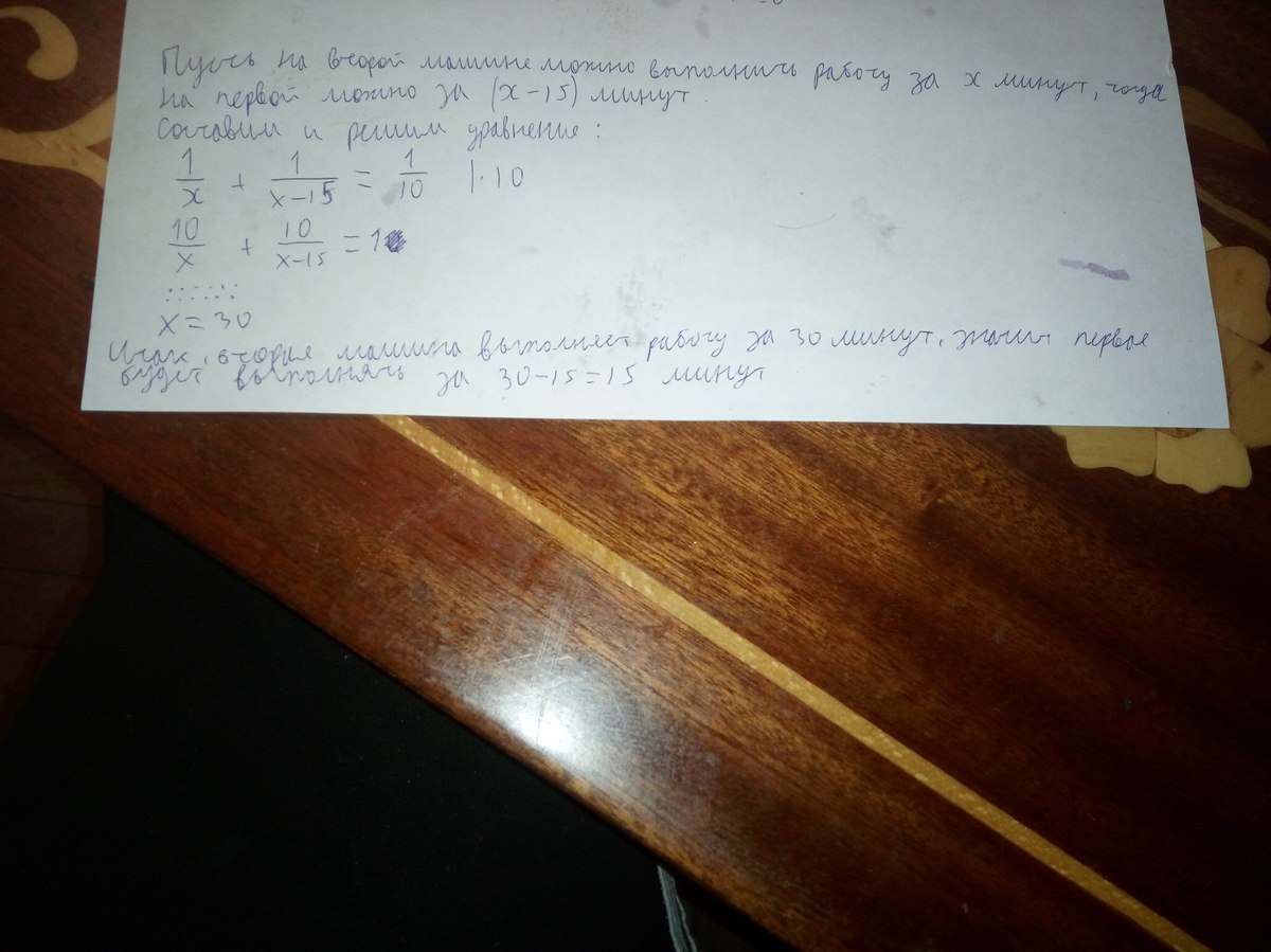 На двух копировальных машинах, работающих одновременно, можно сделать копию пакета документов за 10 мин. За какое время можно выполнить эту работу на каждой машине в отдельности, если известно, что первой машине ее можно сделать на 15 мин быстрее, чем на второй? РАЦИОНАЛЬНЫМ УРАВНЕНИЕМ!!!!!!!!!!!!!!!!!