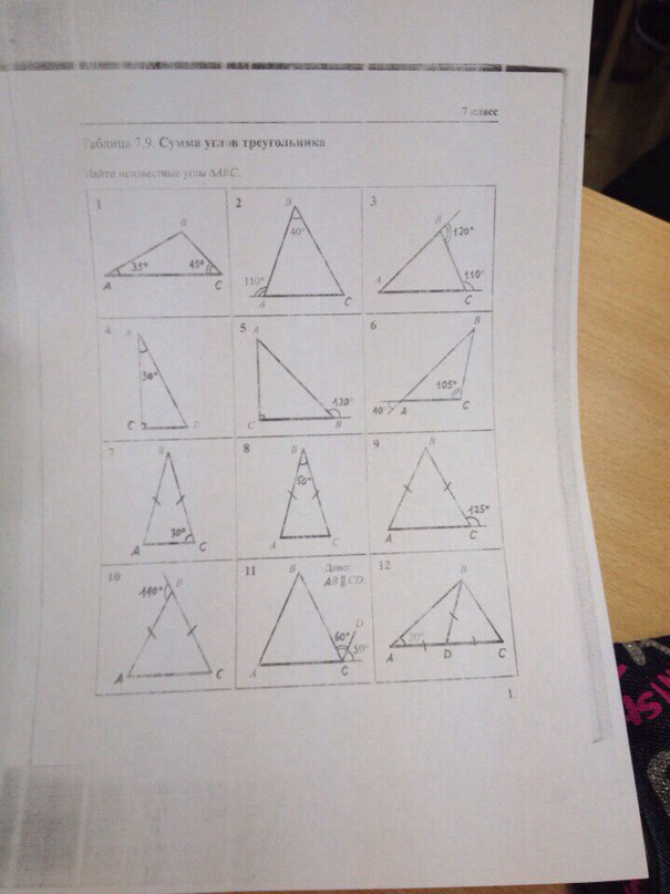 10) Не четко видно. Если данный угол равен 110 градусов, то B=70, C и A = 60, а если данный угол равен 140 градусов, то B=40, C и A=70
