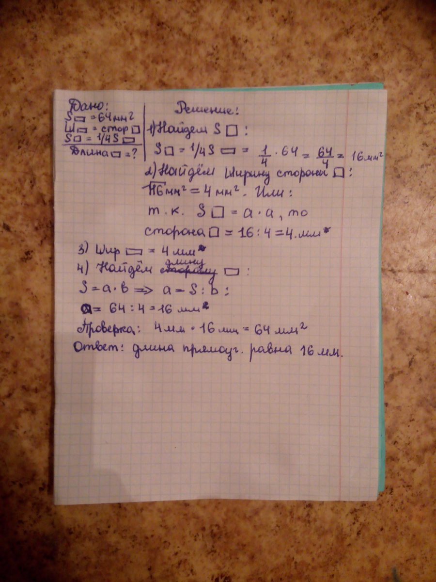 Пожалуйста , помогите решить :....Площадь прямоугольника равна 64 мм2. Ширина его равна стороне квадрата , площадь которого равна одной четвертой части площади прямоугольника. Найди длину прямоугольника.
