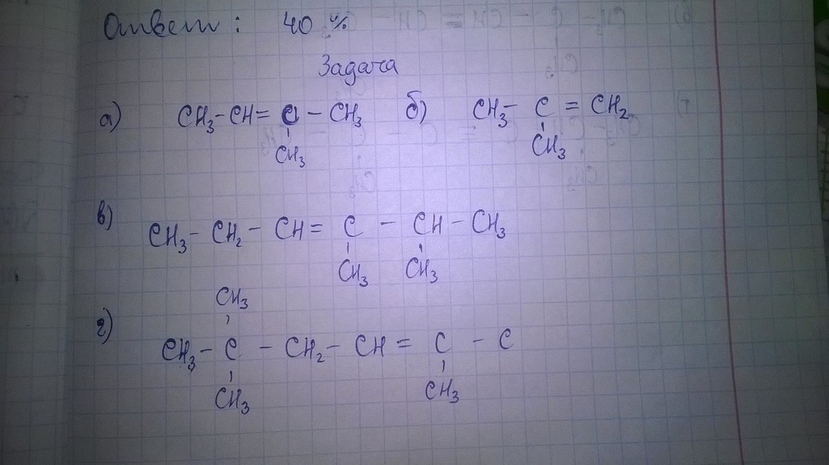 Напишите структурные формулы следующих углеводородов: а) 2-метилбутен-2, б) 2-метилпропен, в) 2,3-диметилгексен-3, г) 2,5,5-триметилгексен-2, д) цис-4-метилпентен-2.