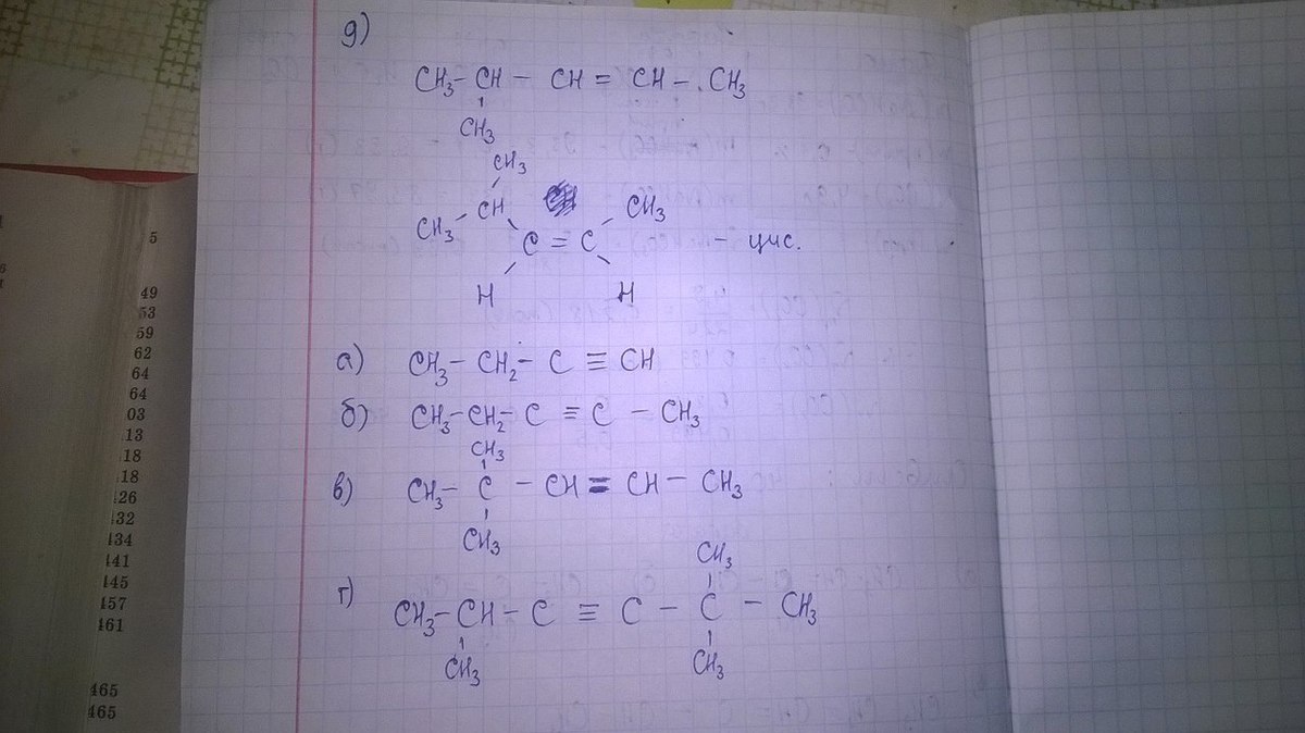 Напишите структурные формулы следующих алкинов: а) бутина-1, б) пентина-2, в) 4,4-диметилпентена-2, г) 2,2,5-триметилгексина-3.