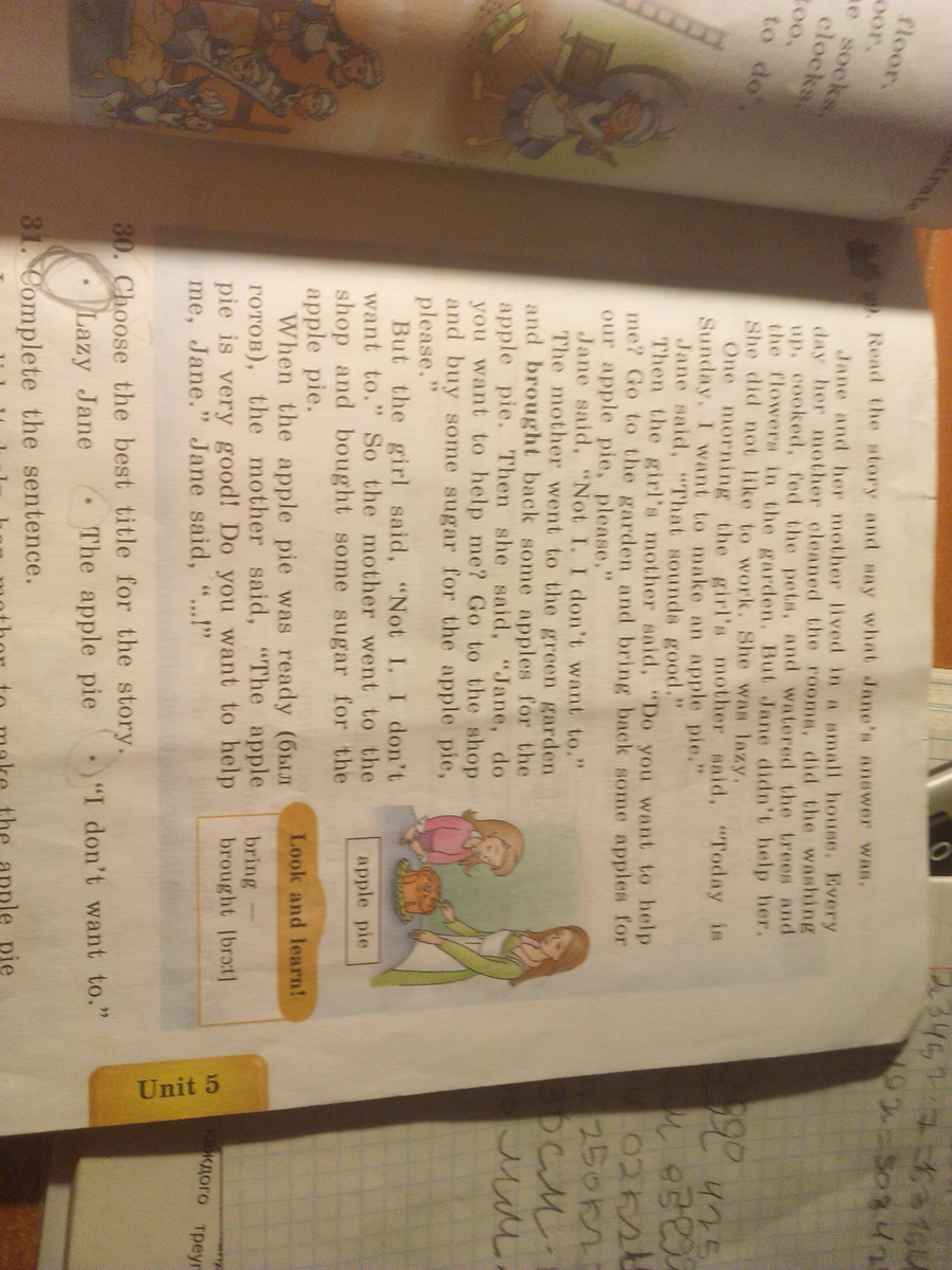 Мама пошла в зелёный сад и принесла несколько яблок для яблочного пирога. Затем она сказала :" Джейн, не хотела бы ты мне помочь? Сходи в магазин и купи немного сахара для яблочного пирога, пожалуйста"