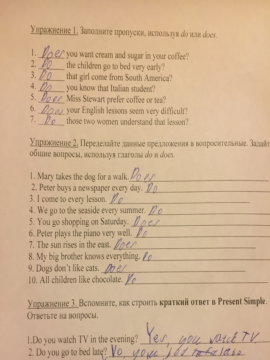 Упр.1 1)Do 2)Do3)Does4)Do5)Does6)Do7)Do Упр.2 1)Does Mary take the dog for a wolk?2)Does Peterbuy a newspaper every day?3)Do you come to every lesson?4)Do you go to the seaside every summer?5)Do you go shopping on Saturday?6)Does Peter play the piano very well?7)Does the sun rise in the east?8)Do your brother know everything?9)Do dogs like cats?10)Do all children like chocolate? Упр.3 1)Yes,I watch2)No,I don't