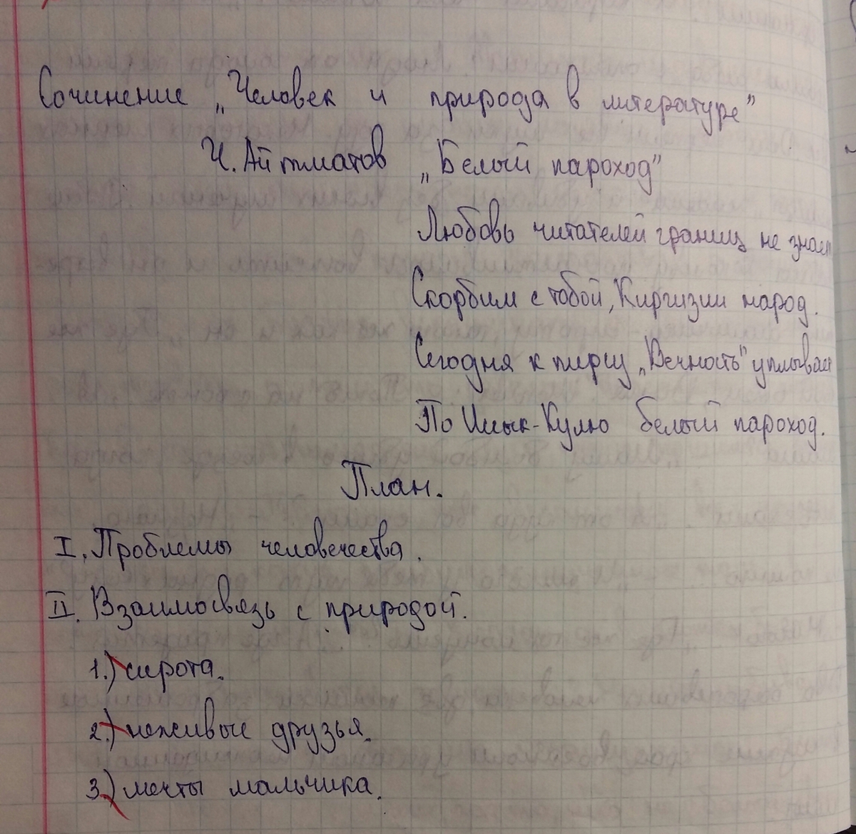 2. В своей повести автор хочет рассказать, что взаимосвязь с природой крайне важна для человека. Главный герой этой повести -мальчик, который рос сиротой при живых родителях , у него не было друзей. Мальчик поделил свою жизнь на 3 измерения: реальный мир, мифологичкский, и мир сказки. В повести мальчик общался с природой, как с чем-то одушевленным:" Мальчик быстро бежал, перепрыгивая через кустики и обещая валуны, если не по силам было их перескочить, и нигде не задержался ни на секунду -ни возле высоких трав, ни возле камней , хотя знал, что были они вовсе не простые". Он представлял растения своими друзьями:"Они могли обидеться, и даже подставить ножку". Мальчик даже камням давал имена:"...-бросил он на ходу "Лежащего верблюда"- так он назвал рыжий горбатый гранит, по грудь ушедший в землю. Обычно мальчик не проходил мимо, не похлопав своего "Верблюда" по горбу. "Был у него валун "Седло"...,был еще камень "Волк", но самый любимый камень- это "Танк", были еще и другие-"вредные","добрые","хитрые". Среди всех находились и враги:"Колючий бодяк-главный враг". Мальчик рубился с ним десятки раз на дню. Самыми верными друзьями мальчика были ширалджины, он считал их "верными друзьями ":"Особенно, если обида какая-нибудь и хочется плакать, чтобы никто не видел, в ширалджинах лучше всего укрыться". Помимо природы из друзей у него был Расторопный дед Момун, он всегда рассказывал ему легенду о рогатой Матери-Оленихе. Благодаря этой легенде мальчик оставался добрым, и был защищен от окружаещего мира. Мальчик часто взбирался на гору и через бинокль наблюдал за белым пароходом. Он знал, что его отец был матросом и думал, что он находится на пароходе. Мальчик много мечтал о том, как он превратится в рыбу и поплывет по реке к нему, к белому пароходу :"Он мечтал превратиться в рыбу так, чтобы все у него было рыбье-тело,хвост,плавники, чешуя-и только голова бы оставалась своя. Мечтал, чтоб отец его поймал и он сказал:"Здравствуй ,папа, я твой сын. Я приплыл к тебе". Мальчик хотел рассказать отцу про все, что знает, про всю свою жизнь. Но мальчик все таки спустился к реке и ступил прямо в воду. Перед этим мальчик сказал ослабшему Момуну :" Я сделаюсь рыбой. Ты слышишь, ата, я уплыву. А когда придет Кулубек, скажи ему, что я сделался рыбой.". Я считаю, что мальчик не умер, а ушел в свой сказочный мир.
