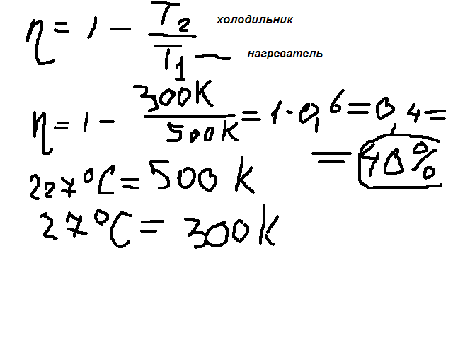 Максимальный КПД идеальной тепловой машины с температурой нагревателя 227 "С и температурой холодильника 27 °С равен