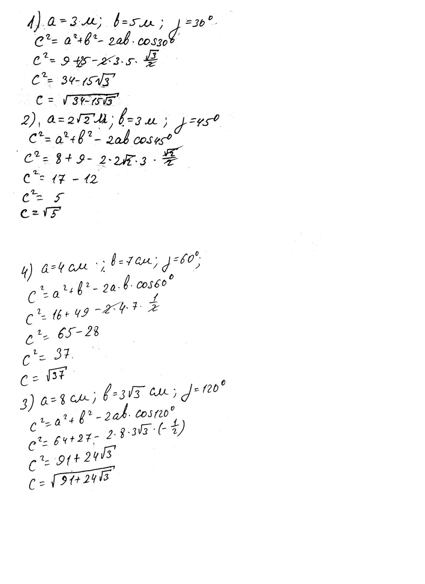 В треугольнике даны стороны a,b и угол γ между ними. Найдите третью сторону С этого треугольника , если 1)а=3 м, b=5 м, γ=30° ; 2)a=2√2 м, b=3 м, γ=45°; 3) a=8 см, b=3√3 см , γ=120°; 4)a=4 см, b=7 см , γ=60°.
