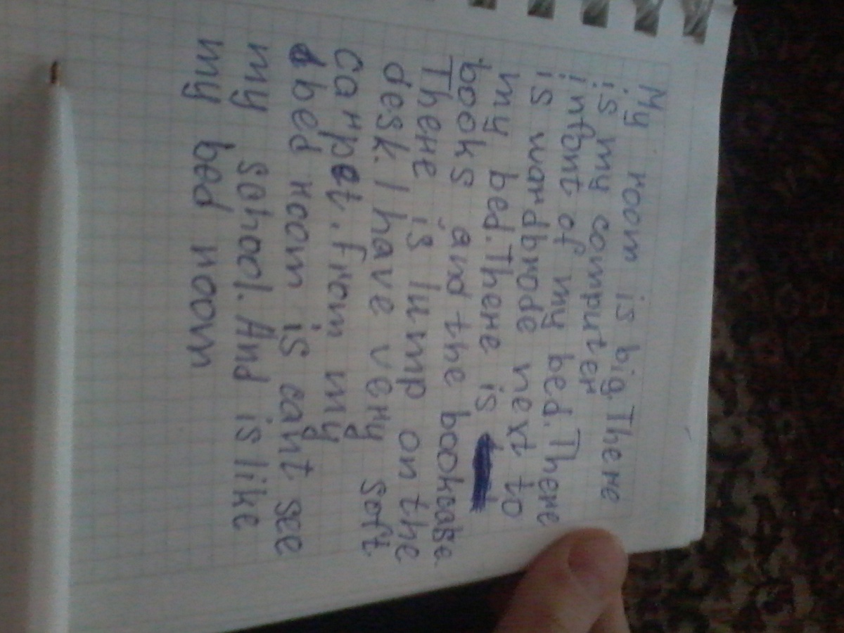 Моя комната очень большая. Это мой компьютер,он находится перед кроватью .Шкаф находится около моей кровати.Здесь находятся книги и книжные полки. на доске висит лампа.У меня очень мягкий ковер.Из моей спальни невозможно увидеть мою школу.(последнее предложение странно написано)