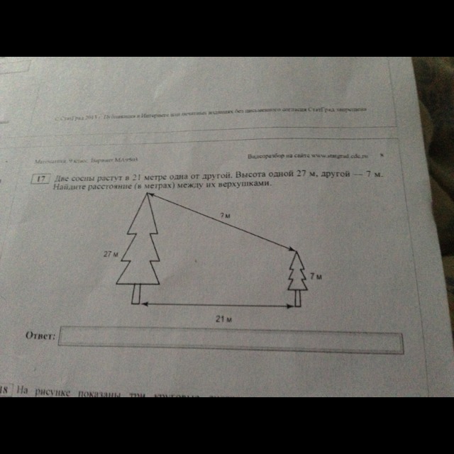 2 сосны растут в 21 метре одна от другой. высота одной 27м, другой-7м. найдите расстояние в метрах между их верхушками
